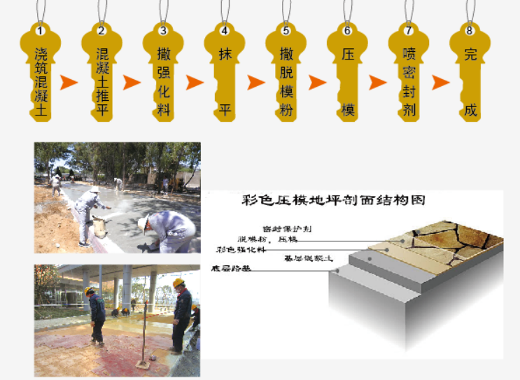 澆筑混凝土——混凝土推平——撒強(qiáng)化料——抹平——撒脫模粉——壓模——噴密封劑——完成
